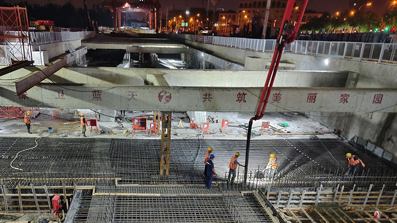 自2022年11月車站主體深基坑開挖施工以來,曆時295天(tian)完(wan)成(cheng)基(ji)坑(keng)開(kai)挖(wa)及(ji)主(zhu)體(ti)結(jie)構(gou)封(feng)頂(ding)。因(yin)車(che)站(zhan)位(wei)於(yu)合(he)淮(huai)路(lu)與(yu)四(si)裏(li)河(he)路(lu)交(jiao)叉(cha)口(kou)東(dong)側(ce),坐(zuo)落(luo)於(yu)大(da)楊(yang)鎮(zhen)政(zheng)府(fu)對(dui)麵(mian),四(si)裏(li)河(he)路(lu)及(ji)合(he)淮(huai)路(lu)均(jun)為(wei)城(cheng)區(qu)主(zhu)幹(gan)道(dao),車(che)流(liu)量(liang)大(da),地(di)表(biao)主(zhu)要(yao)為(wei)市(shi)政(zheng)道(dao)路(lu),地(di)下(xia)管(guan)線(xian)較(jiao)多(duo),且(qie)本(ben)工(gong)程(cheng)緊(jin)鄰(lin)合(he)肥(fei)市(shi)重(zhong)點(dian)保(bao)護(hu)的(de)飲(yin)用(yong)水(shui)水(shui)源(yuan)董(dong)鋪(pu)水(shui)庫(ku)、大房郢水庫,施工過程中環境、水源保護要求高,工程開工以來在各方參建單位的大力指導和幫扶下,依次解決臨時用地、綠化遷移、管線遷改等困難。在麵對多種挑戰的情況下,項目部全體人員齊心協力、精心組織、攻堅克難,日夜奮戰堅守建設一線。