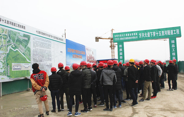 3月8日下午,十五裏河濕地工程和方興大道下穿十五裏河隧道工程項目(以下簡稱方興大道項目)迎來了安徽理工大學土木工程專業參觀團,近百名學子在項目駐地及施工現場進行了係統的學習、交流。