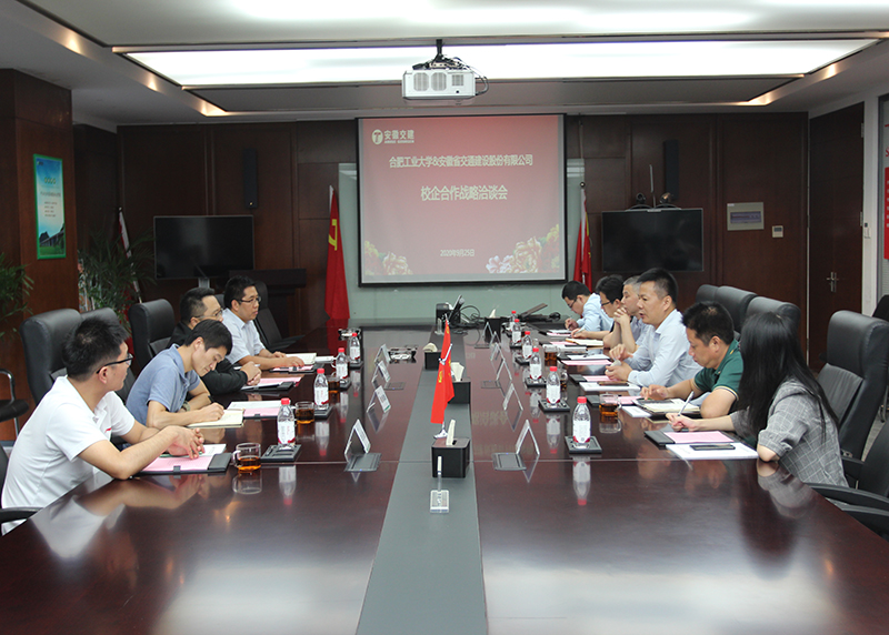2020年9月25日下午,合肥工業大學汽車與交通工程學院黨委副書記、紀委書記張金偉等一行四人蒞臨安徽省交通建設股份有限公司,就校企戰略合作相關事宜進行洽談。公司總裁彭小毛、總工程師儲根法、副總裁陳明洋等出席洽談會,會議由交建股份副總裁吳小輝主持。
