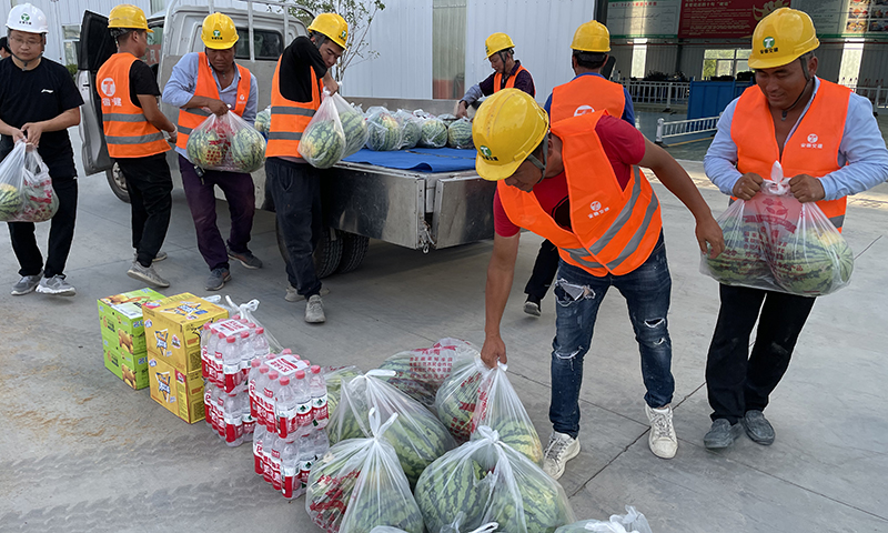 6月21日,安徽省交通建設股份有限公司慰問組帶著從三十崗新鮮采摘的10000斤西瓜,前往合肥地區在建的十個項目現場,親切慰問奮戰在一線的管理者和勞動者們。