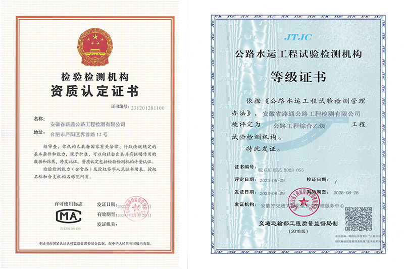 安徽省路通公路工程檢測有限公司成立於2003年7月。現擁有公路工程綜合乙級檢測資質、排水管道檢測及評估作業能力III級作業證書,並通過了檢驗檢測機構資質認定。2021年12月16日,獲批“高新技術企業”。各專業試驗檢測人員配備齊全,具備開展集料、鋼材、土工、瀝青及瀝青混合料、水泥及水泥混凝土、砂漿、無機結合料、水、外加劑、磚以及路基路麵、混凝土結構物、基坑地基與基樁、橋梁結構、交安設施、公路與橋梁技術狀況和城鎮排水管道檢測等多項試驗檢測的能力。