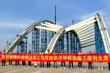 11月11日,隨著最後一段拱肋緩緩吊裝至合龍位置,安徽交建承建的廣德路項目跨南淝河大橋拱肋邊拱順利合龍。