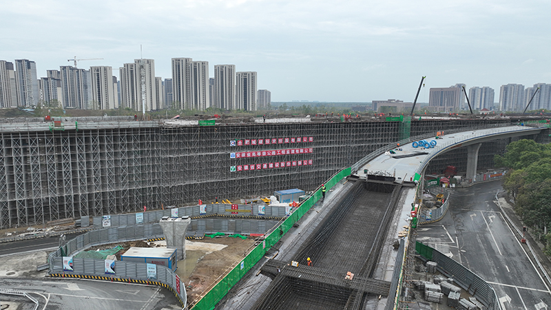 宿鬆路(南二環~深圳路)快速化改造工程7標段全長4.35公裏,其中高架橋段北起紫石路,上跨雲穀路、始信路、雲海路、珠江路,經龍灣路連接地麵係統,長2.25公裏。項目自7月21日封閉施工開始至主線箱梁混凝土澆築結束,累計綁紮鋼材2.2萬噸,澆築混凝土12萬立方米,完成產值近4.8億元。