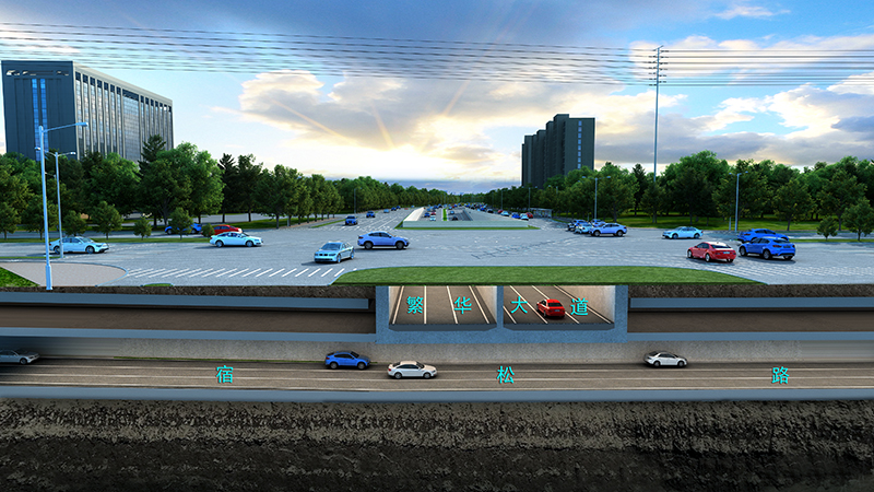 宿鬆路2標全長2815m,北起繞城高速,下穿壩下路、繁華大道、軒轅路,上跨花園大道、南至慈光路。宿繁交口新建雙層下穿隧道,宿鬆路隧道位於負二層,長1250m,繁華大道隧道位於負一層,長349m。新建花園大道跨線橋一座,長420m;同時,新建壩下路、智能科技園人行天橋2座。