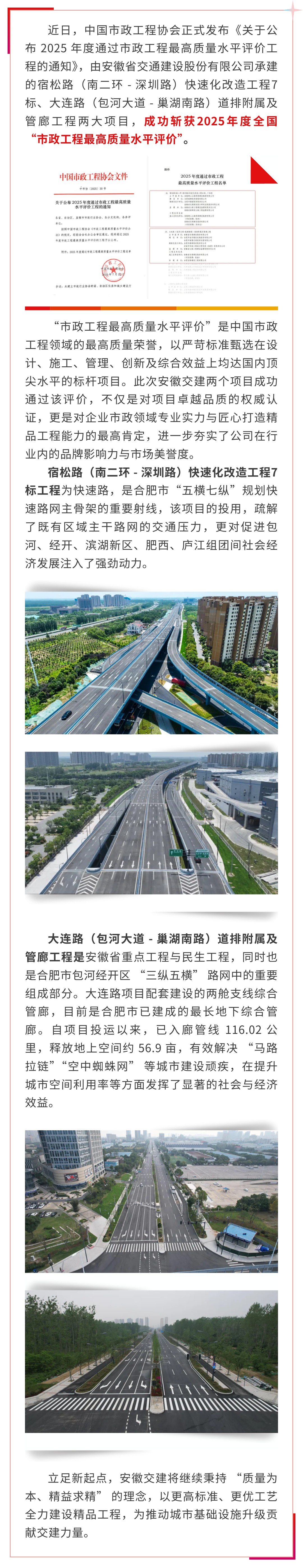 喜報!安徽交建兩項目斬獲2025年度市政工程最高質量水平評價
